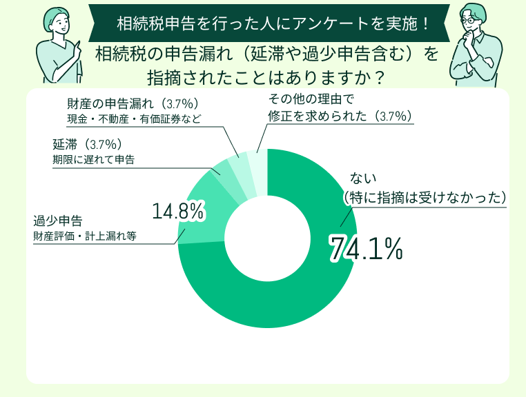 アンケートでは、「特に指摘を受けなかった」人が74.1%と大多数を占めました。一方で、過少申告(14.8%)や延滞・申告漏れ・修正指摘(各3.7%)など、全体の約4人に1人が何らかの指摘を受けている結果となりました。