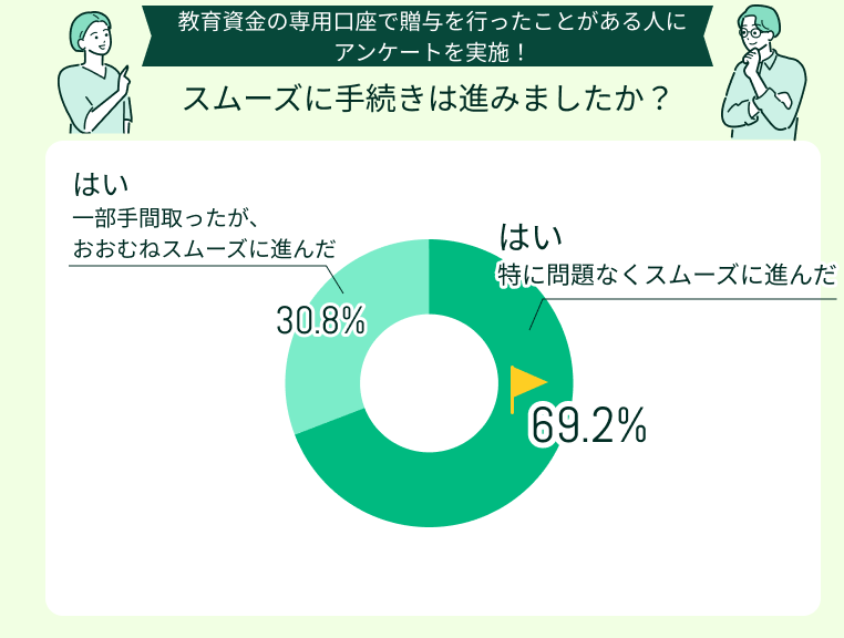 手続きを行った多くの人が「大きな問題はなかった」と回答しており、教育資金贈与の手続き自体は比較的シンプルであることがうかがえます。一方で、必要書類の準備や窓口での確認に時間がかかったという声もあり、事前準備の有無で負担が大きく変わる傾向があります。