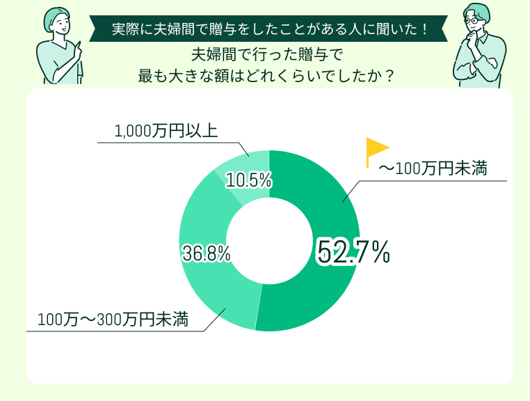 一方で、1,000万円以上の高額贈与を行った人も10.5%存在しており、一定の割合で大規模な資産移動が夫婦間でも行われていることが明らかになりました。