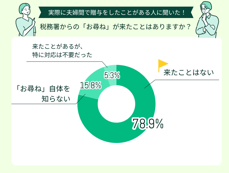 次に多かったのは「お尋ね自体を知らない」という回答です。贈与の手続きやリスクに関する知識が十分ではないまま夫婦間でお金のやり取りをしている家庭も一定数存在していることがわかります。
