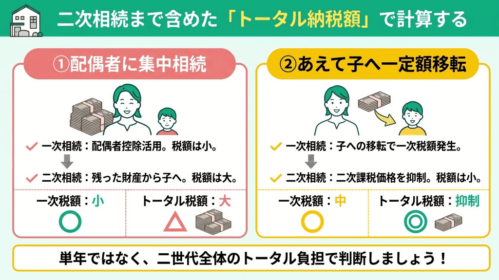 相続対策は「今回だけ安ければ良い」とは限りません。二次相続まで見据えることで、最適な分け方が見えてきます。