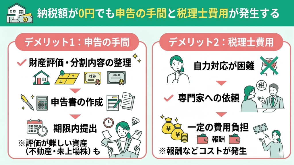 「税金がかからない=なにもしなくていい」は誤解です。相続税が発生しないと聞くと安心しがちですが、実務上は別の負担が生じます。