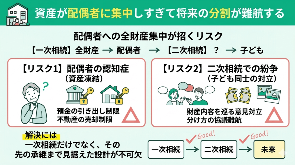配偶者に全財産を集中させると、将来の相続で思わぬ問題が生じる可能性があります。例えば、配偶者が認知症を発症した場合、預金の引き出しや不動産の売却が制限され、いわゆる資産凍結の状態になる恐れがあります。
