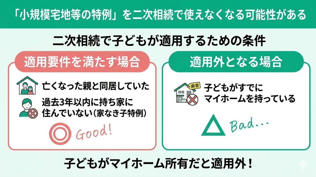 配偶者にすべての財産を相続させると、将来子どもが自宅を相続する「二次相続」の際に、「小規模宅地等の特例」が使えなくなるリスクがあります。