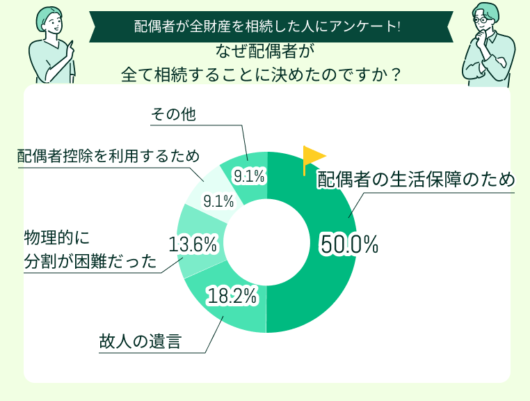 アンケートの結果、配偶者が全財産を相続した理由の半数を占めたのが「配偶者の今後の生活保障(老後の生活費や介護費用の不安)」でした。残された大切なご家族の生活は、何よりも最優先で守りたいですよね。