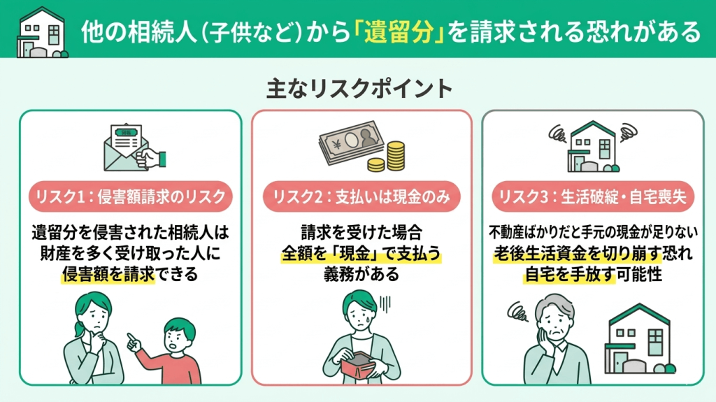 他の相続人(子供など)から「遺留分」を請求される恐れがある