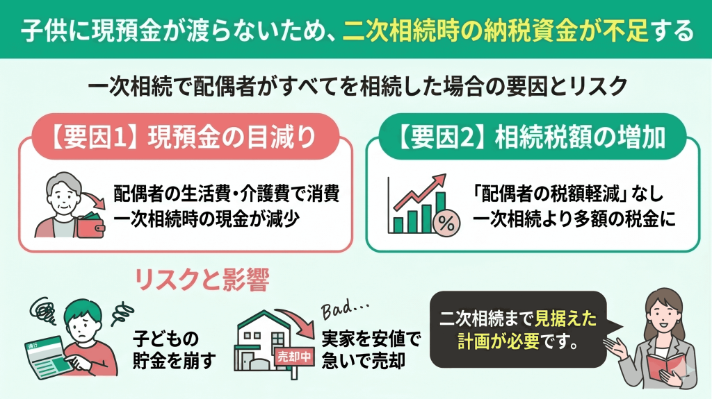 | 二次相続における納税資金不足の要因 | 影響と具体的なリスク |