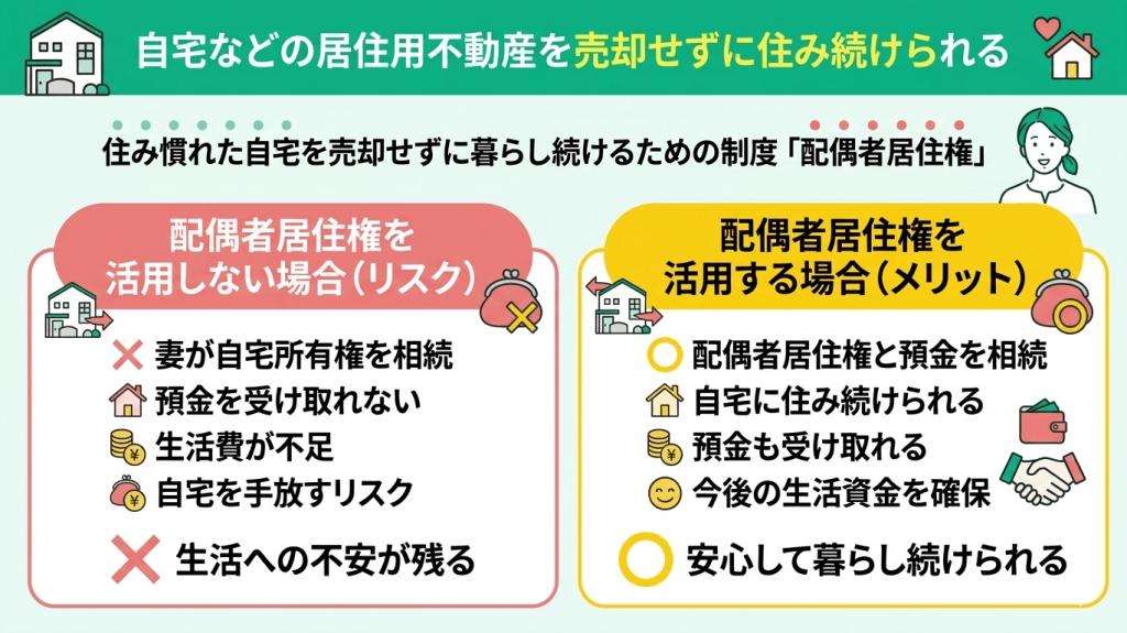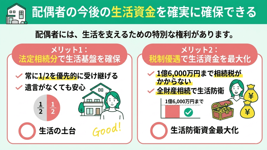 これにより、住居の確保はもちろん、老後の医療・介護費用といった長期的なキャッシュフローの安定に直結します。特に「配偶者の税額軽減」制度を活用すれば、1億6,000万円または法定相続分まで相続税がかからないため、全財産を配偶者が相続することで当面の生活防衛資金を最大化できるのが大きなメリットです。