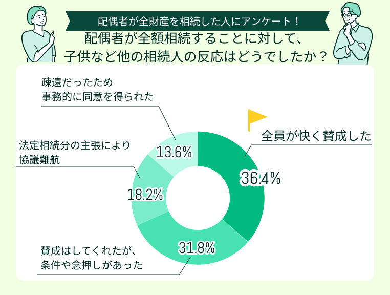配偶者が全ての遺産を相続する場合、お子様など他のご家族がどう感じるか気になりますよね。アンケート結果を見ると、意外にも反応が分かれていることが分かります。