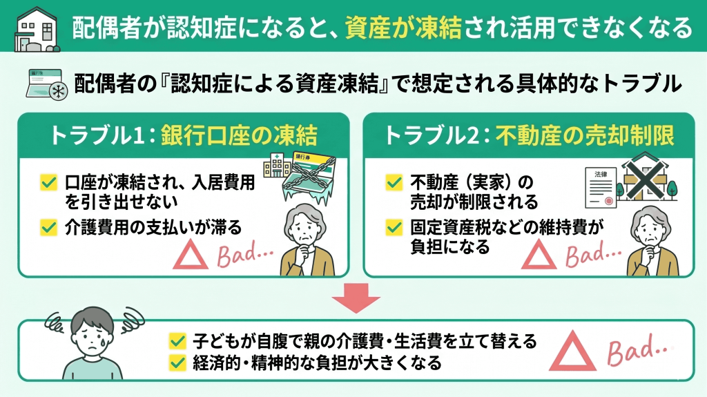 配偶者へ全財産を相続した後に注意したいのが、「認知症による資産凍結」です。もし配偶者の意思能力が低下すると、銀行口座の凍結や不動産の売却制限がかかるリスクがあります。