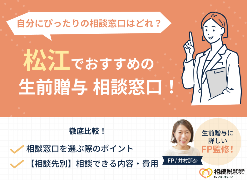 「松江・島根でおすすめの生前贈与相談窓口はどこ?」とお悩みの方に、松江・島根でおすすめの生前贈与相談窓口5社と、失敗しない相談窓口の選び方を解説します。 松江・島根で生前贈与相談先を探す時によくある失敗例として、「担当FPが経験不足だった」...
