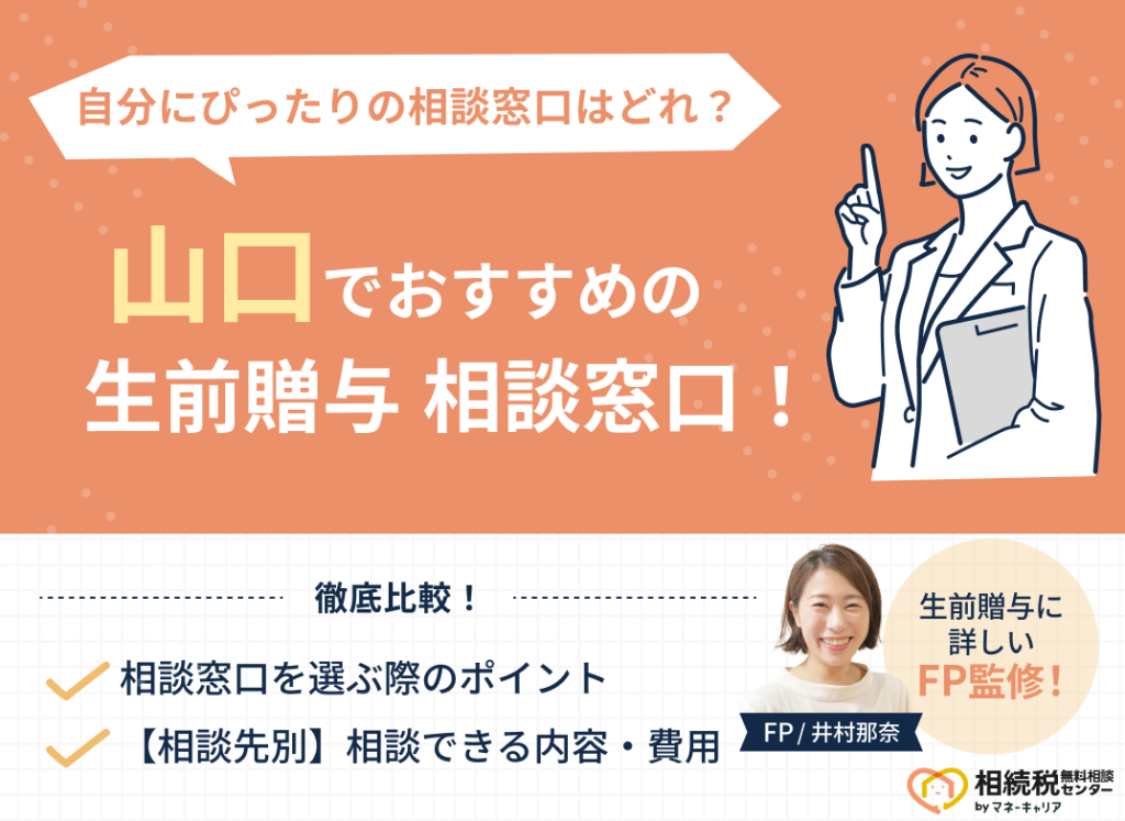 「山口でおすすめの生前贈与相談窓口はどこ?」とお悩みの方に、山口でおすすめの生前贈与相談窓口5社と、失敗しない相談窓口の選び方を解説します。 山口で生前贈与相談先を探す時によくある失敗例として、「担当FPが経験不足だった」「おすすめさ... -