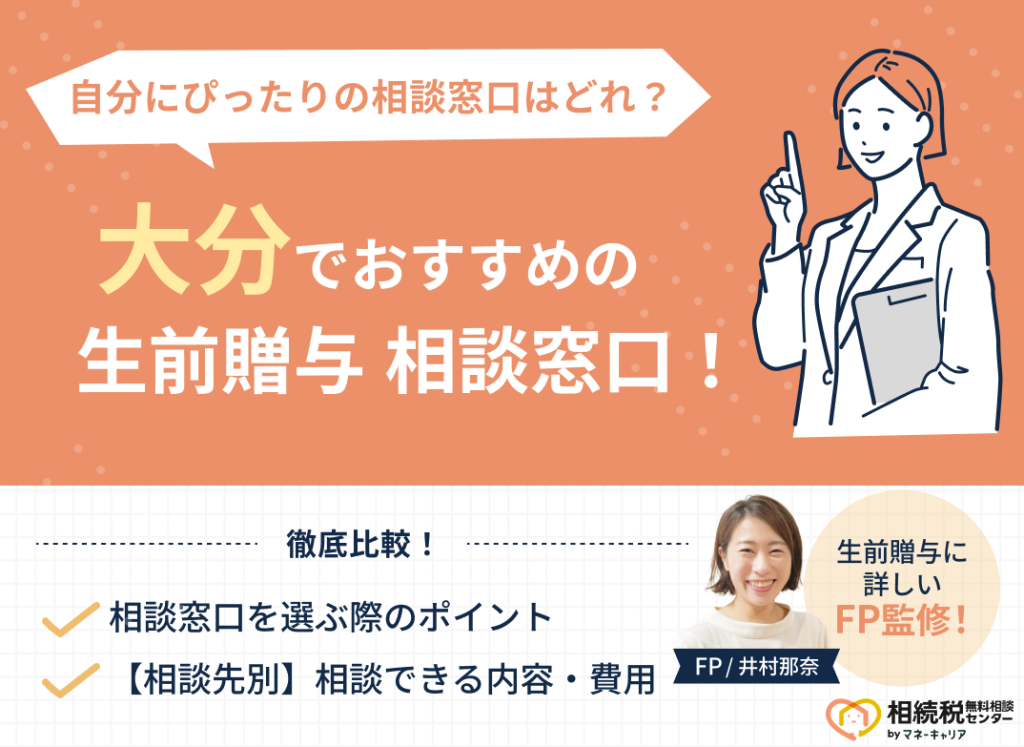「大分でおすすめの生前贈与相談窓口はどこ?」とお悩みの方に、大分でおすすめの生前贈与相談窓口5社と、失敗しない相談窓口の選び方を解説します。 大分で生前贈与相談先を探す時によくある失敗例として、「担当FPが経験不足だった」「おすすめされた方... -