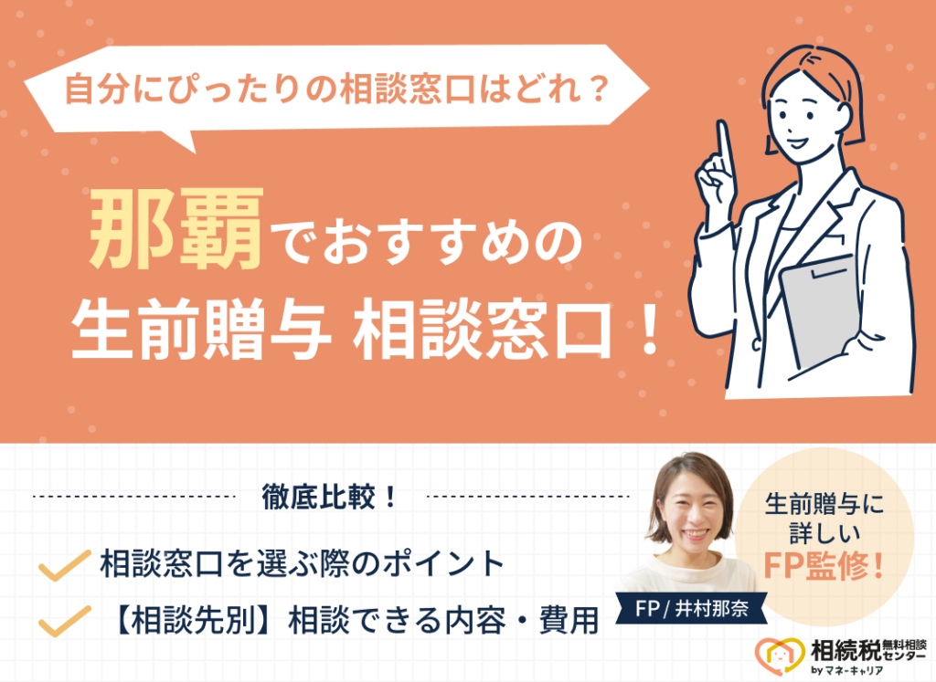 「那覇(沖縄)でおすすめの生前贈与相談窓口はどこ?」とお悩みの方に、那覇(沖縄)でおすすめの生前贈与相談窓口5社と、失敗しない相談窓口の選び方を解説します。 那覇(沖縄)で生前贈与相談先を探す時によくある失敗例として、「担当FPが経験不足だ... -