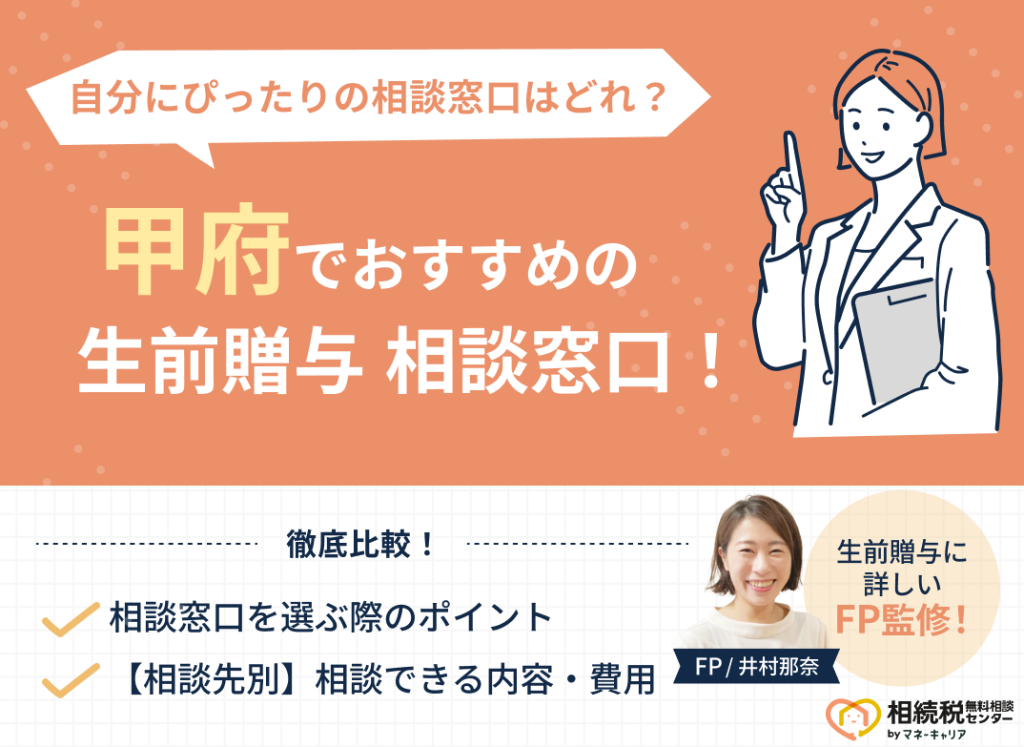「甲府・山梨でおすすめの生前贈与相談窓口はどこ?」とお悩みの方に、甲府・山梨でおすすめの生前贈与相談窓口5社と、失敗しない相談窓口の選び方を解説します。 甲府・山梨で生前贈与相談先を探す時によくある失敗例として、「担当FPが経験不足だった」... -