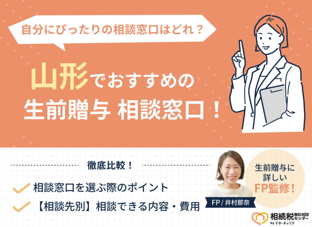 「山形でおすすめの生前贈与相談窓口はどこ?」とお悩みの方に、山形でおすすめの生前贈与相談窓口5社と、失敗しない相談窓口の選び方を解説します。 山形で生前贈与相談先を探す時によくある失敗例として、「担当FPが経験不足だった」「おすすめされた方... -