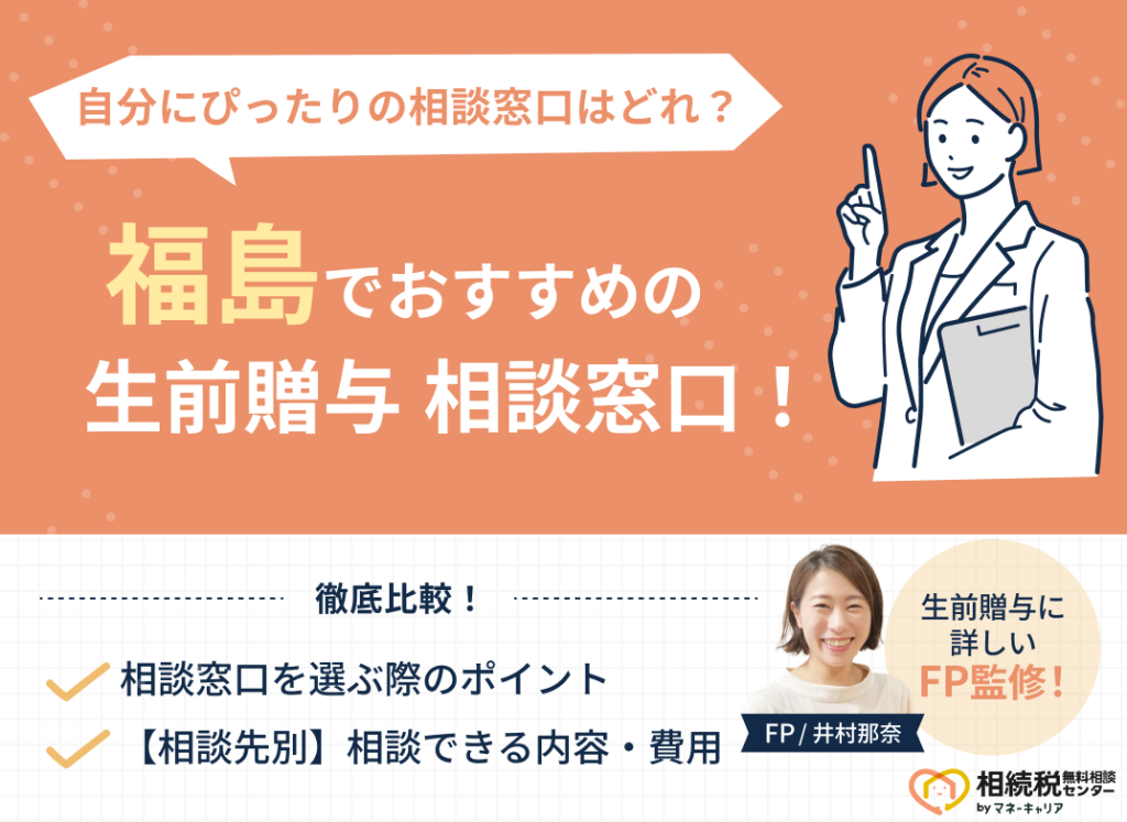 「福島でおすすめの生前贈与相談窓口はどこ?」とお悩みの方に、福島でおすすめの生前贈与相談窓口5社と、失敗しない相談窓口の選び方を解説します。 福島で生前贈与相談先を探す時によくある失敗例として、「担当FPが経験不足だった」「おすすめされた方... -